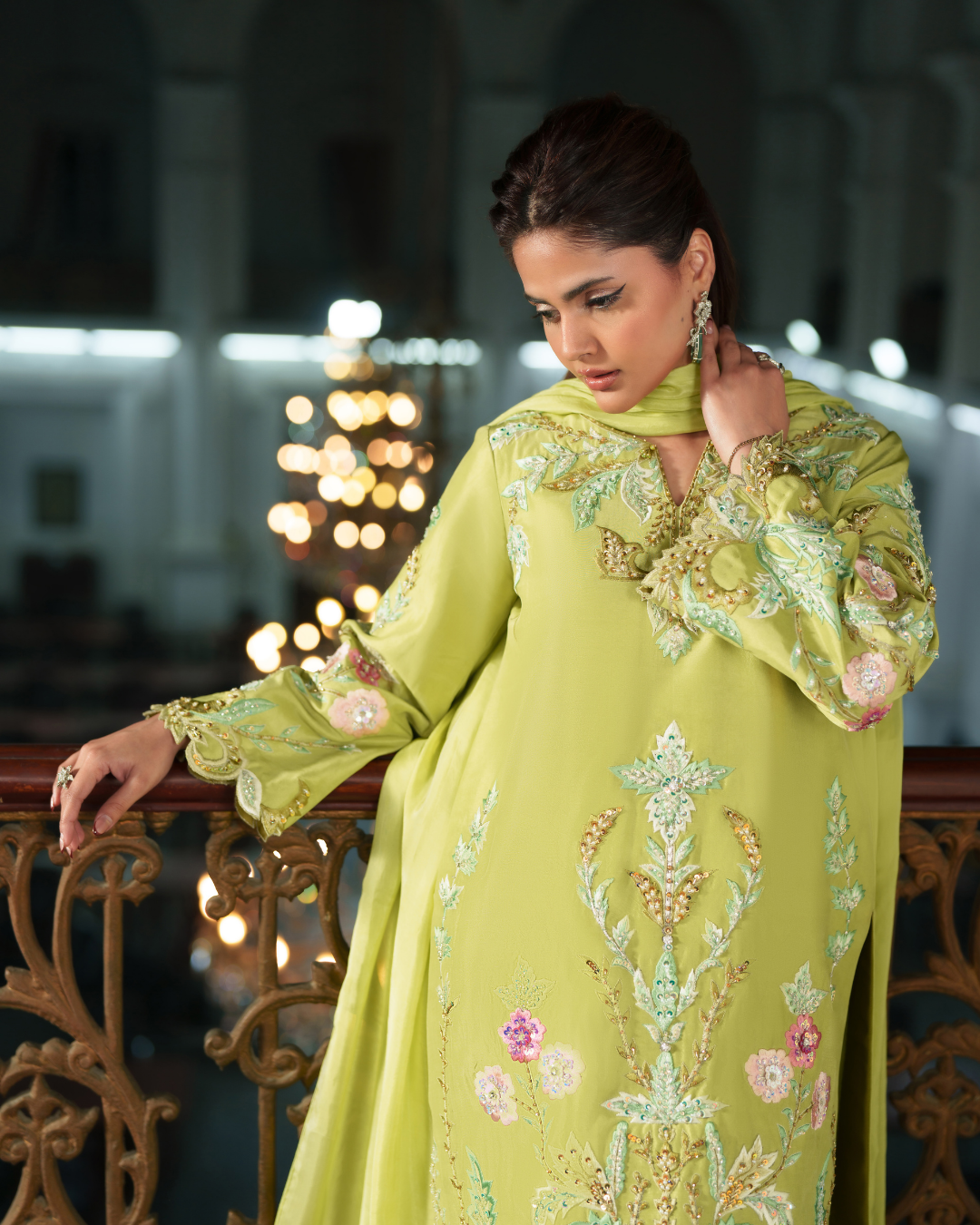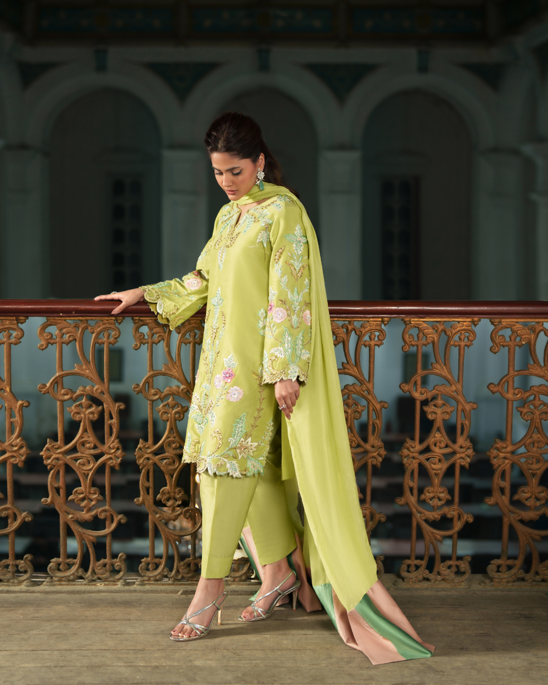 Blended silk in a radiant neon green, paired with a sleek shalwar and delicately embroidered shirt in lush shades of green. Highlighted florals in soft pinks and lilacs bloom across the canvas, while sequins and drop embellishments add the perfect festive sparkle.