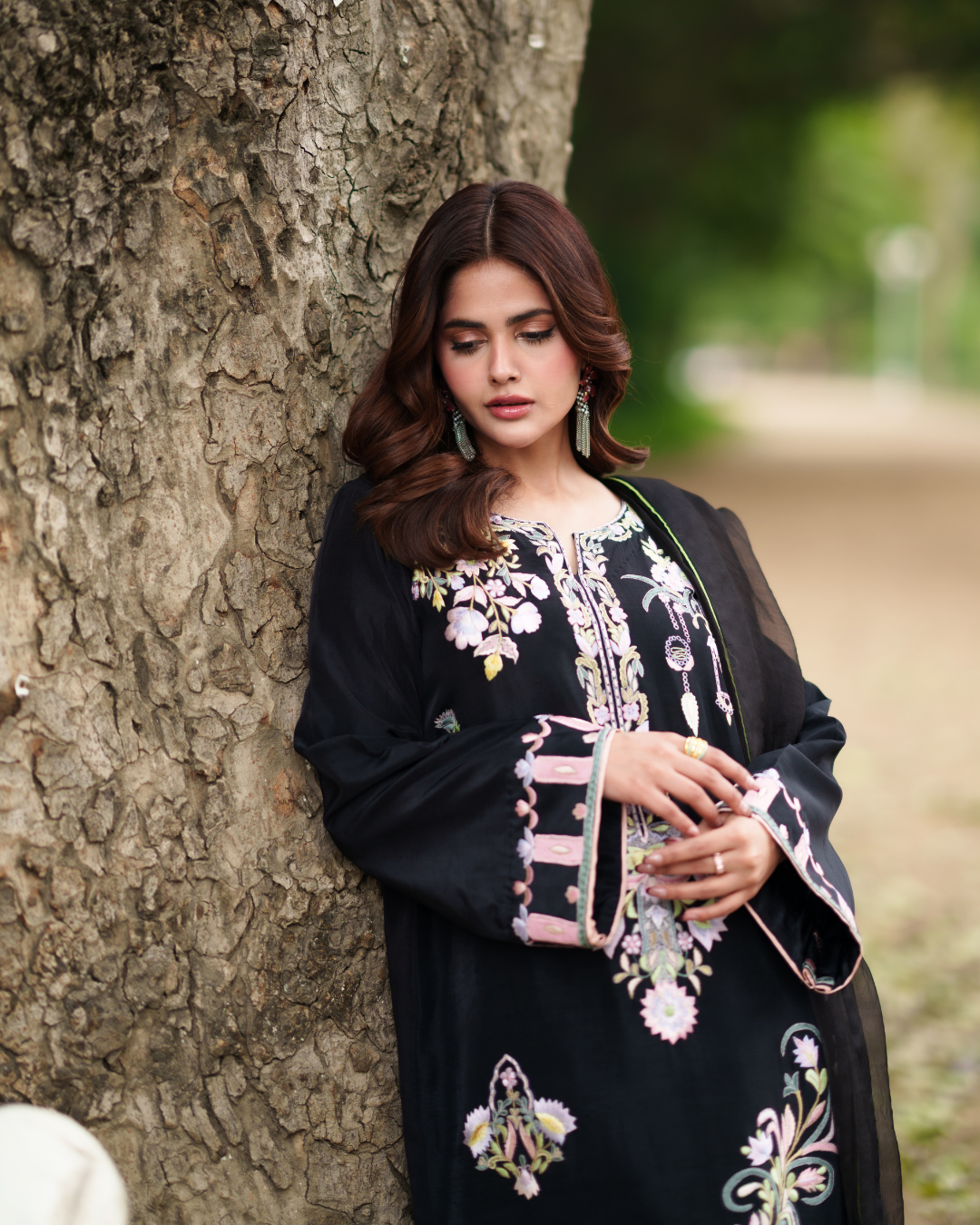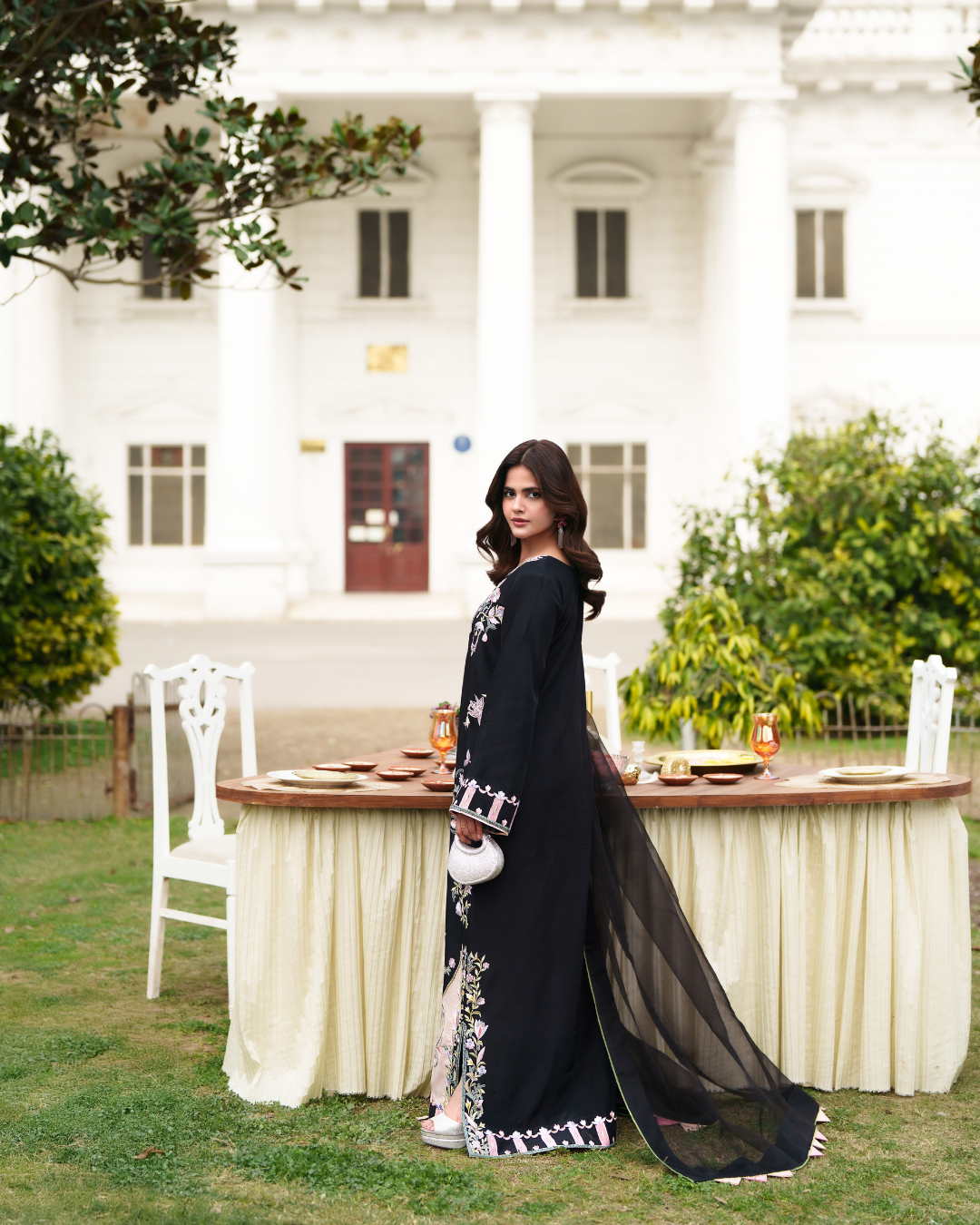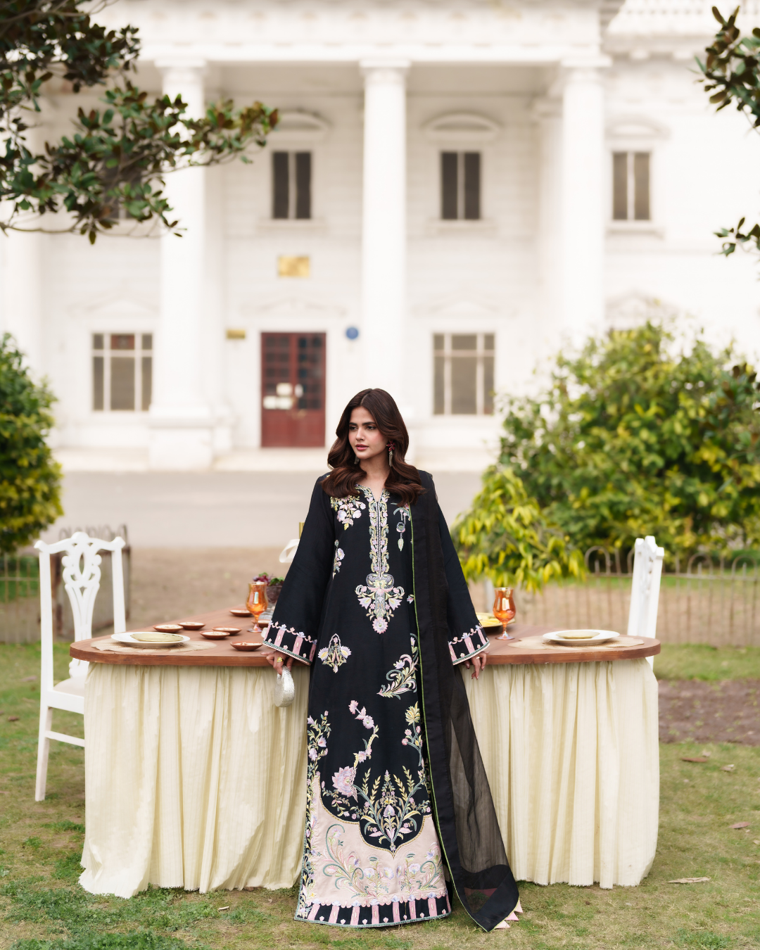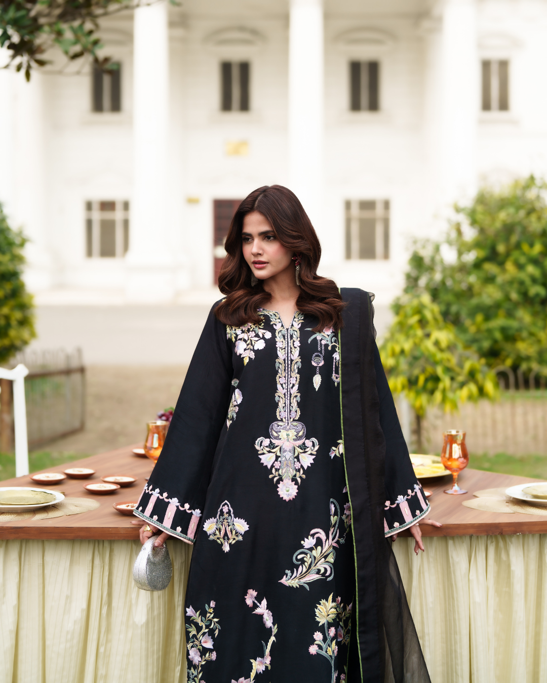 Crafted on a rich ebony canvas, this elongated kaftan celebrates intricate artistry and refined craftsmanship. Delicate machine embroidery in soft pastels unfolds like a painted garden, thoughtfully placed to enhance the fluid silhouette. The straight cut lends understated sophistication, while tailored pants create a seamless, elongated finish. A pure organza dupatta, subtly detailed with fine stitching, adds depth and ethereal charm. Balanced, graceful, and contemporary, the ensemble exudes quiet luxury. Designed for the woman who values impeccable detail and effortless, confident elegance.