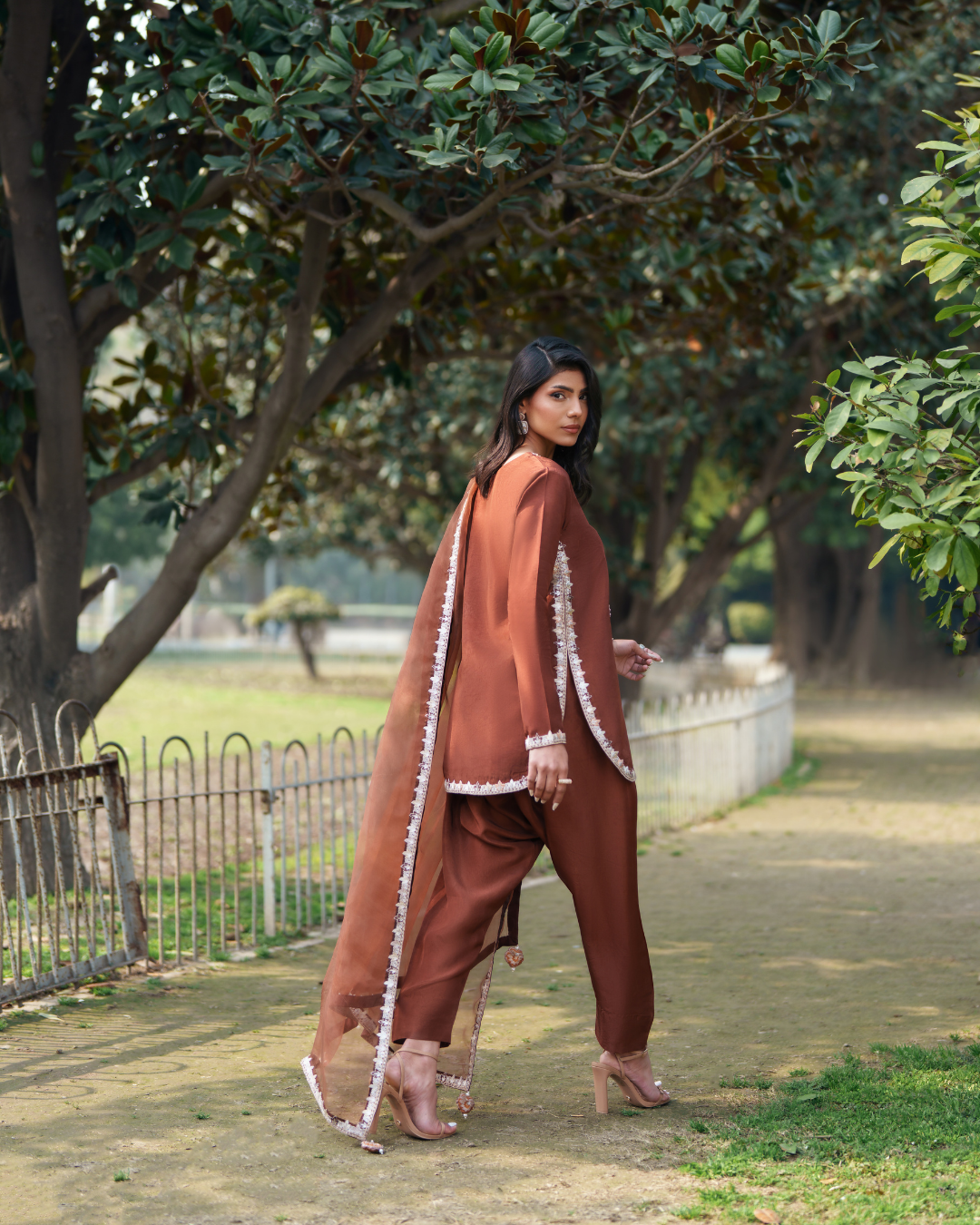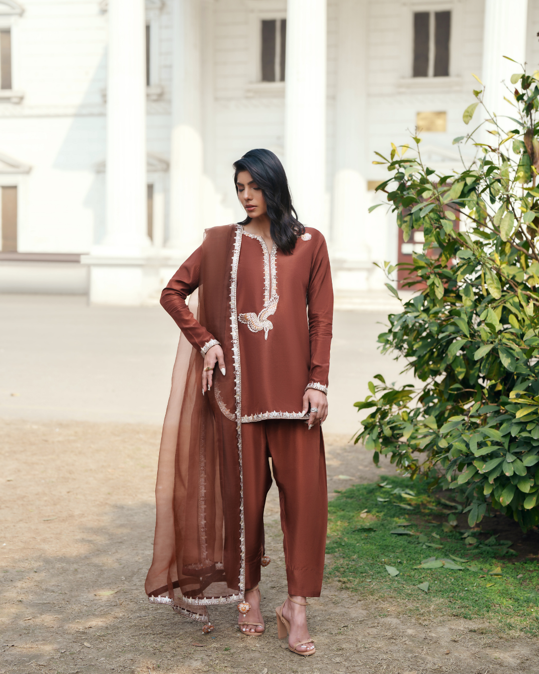 Rendered in an airy blended silk fabric, this ensemble unfolds in a warm mocha brown hue that exudes quiet sophistication. The short shirt is adorned with contemporary embroidery techniques, delicately infused with subtle resham and tilla work, while hints of dabka and cutdana detailing illuminate the neckline with a festive glow. Paired with a modern silk shalwar that enhances the fluid silhouette, the look strikes the perfect balance between tradition and understated luxury. An effortless organza dupatta, finished with finely crafted borders on all four sides and minimal tassel accents at each corner, adds movement and refinement.