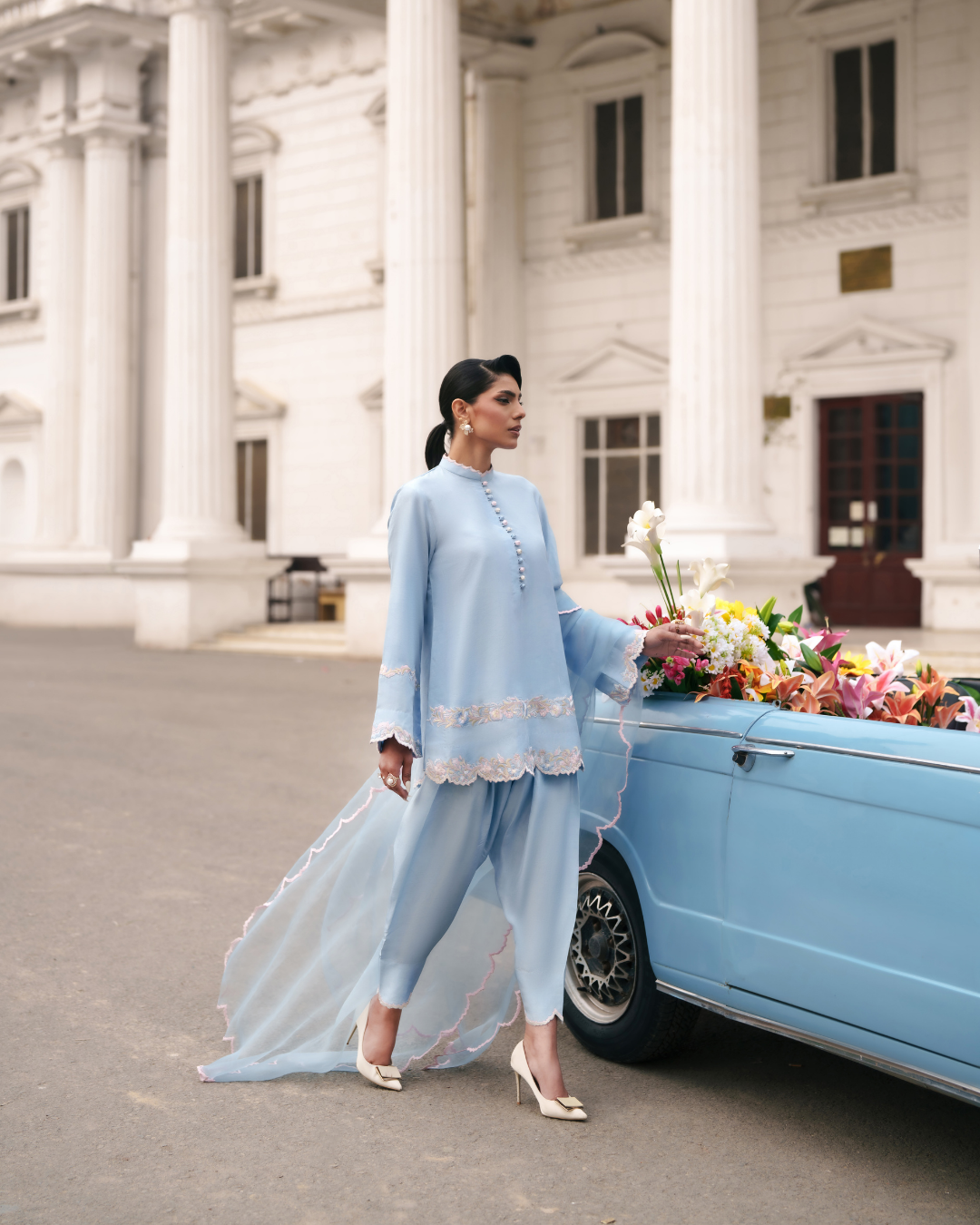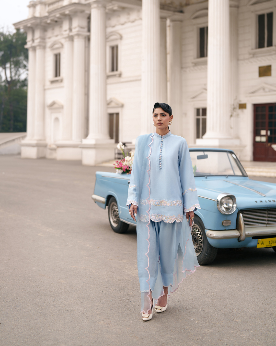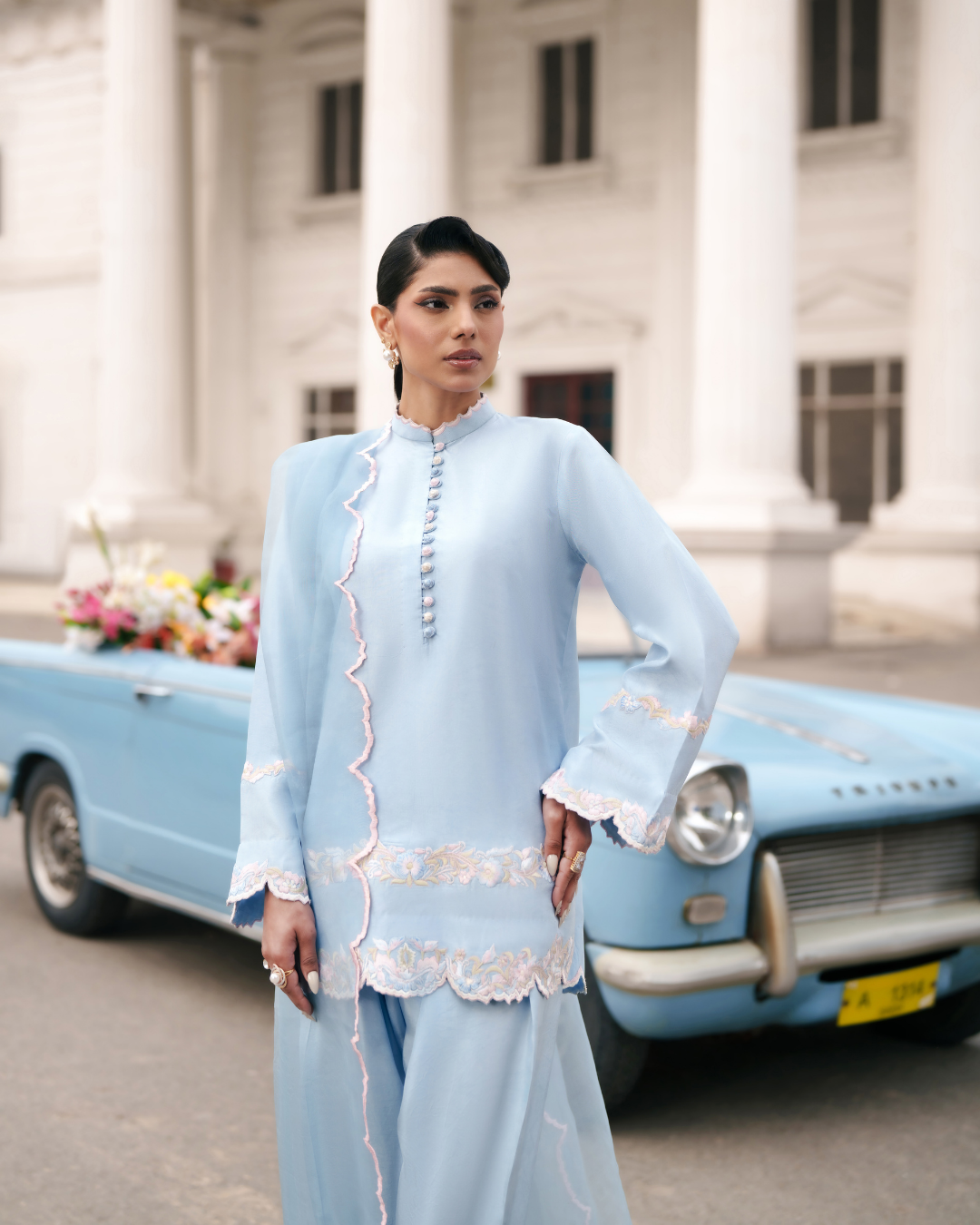 Exquisitely tailored in luminous blended silk in a serene shade of ice blue, this statement ensemble embodies modern festivity. The short shirt is delicately embroidered in soft pastel tones, creating subtle dimension against the cool, graceful base. Paired with a sleek shalwar that enhances the silhouette with effortless fluidity, the look speaks of understated sophistication. Finished with an organza border that adds airy refinement, this ensemble is designed to transition seamlessly from intimate gatherings to Eid soirées.